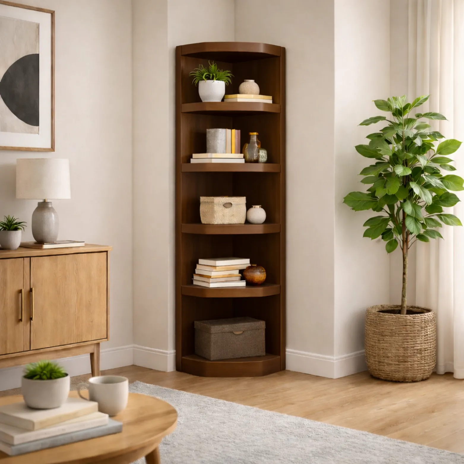 Nos complace presentar nuestro librero esquinero con entrepaños, diseñado para proporcionar una solución práctica y elegante para el almacenamiento por esta razon es perfecto para la exhibición de tus libros y objetos decorativos.